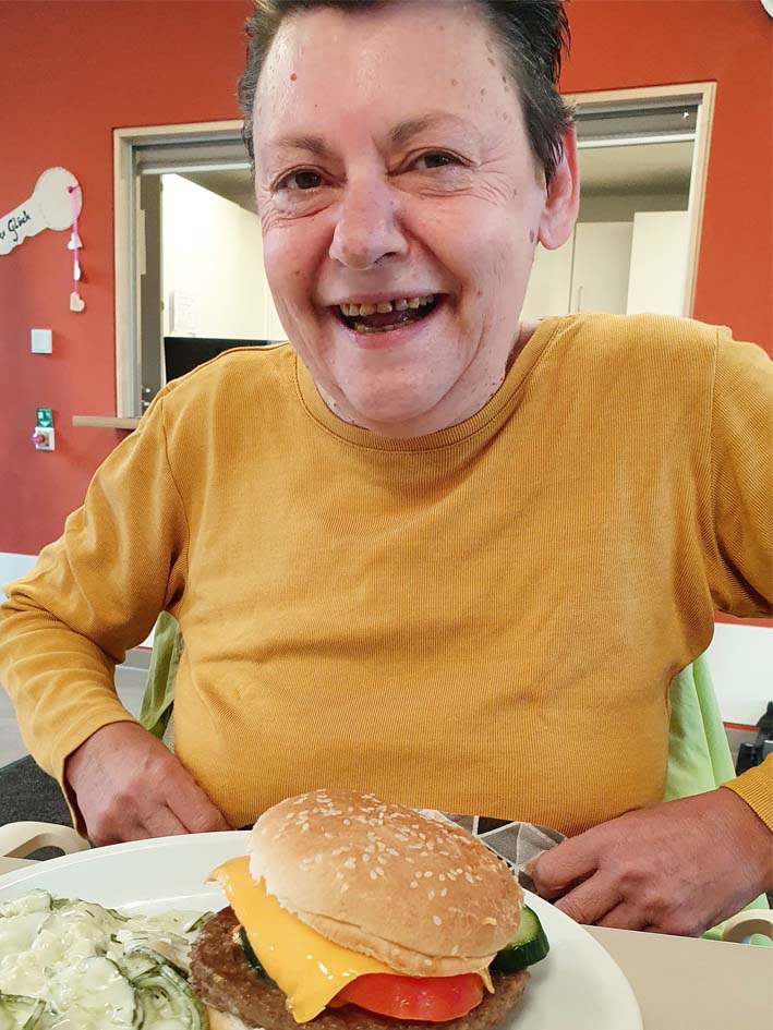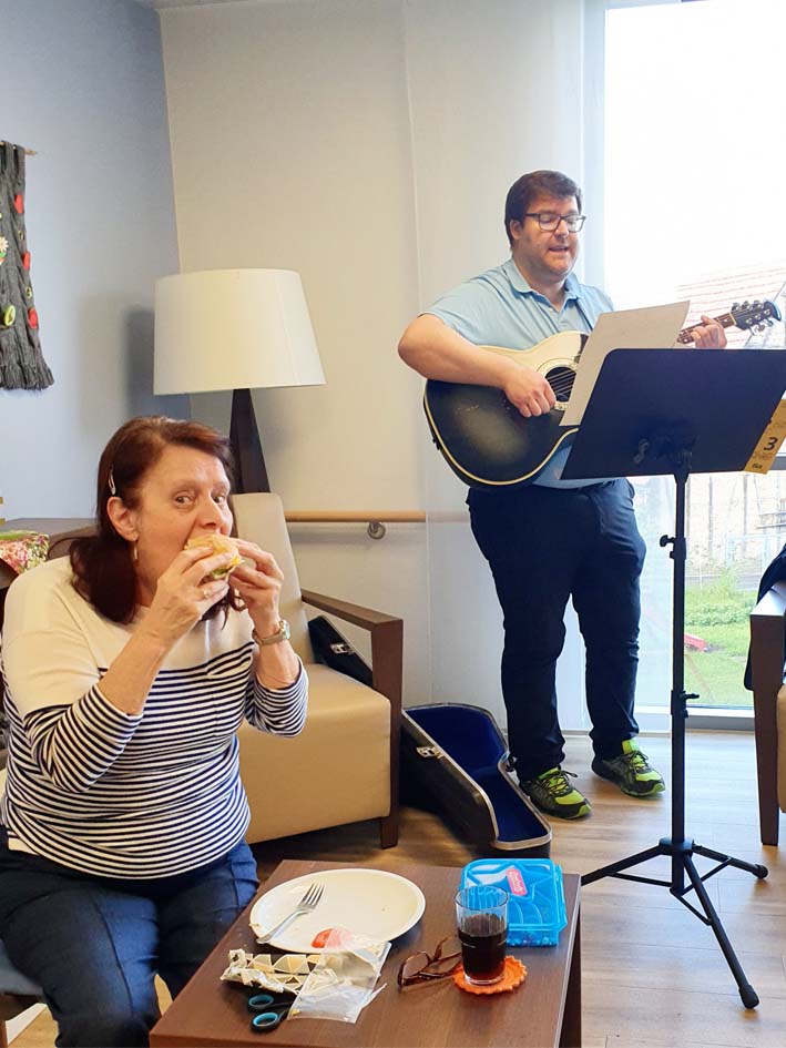 Es gab ein großes Salatbüffet, knusprige Pommes und frisch gegrillte Burger. Diakon Holger Hessenauer begleitete den Abend musikalisch mit der Gitarre. Gemäß dem Motto „American Diner“ hatte er Lieder von John Denver bis hin zu Elvis Presley dargeboten. Mit der Mundharmonika stimmte sogar ein Bewohner in die Lieder ein.