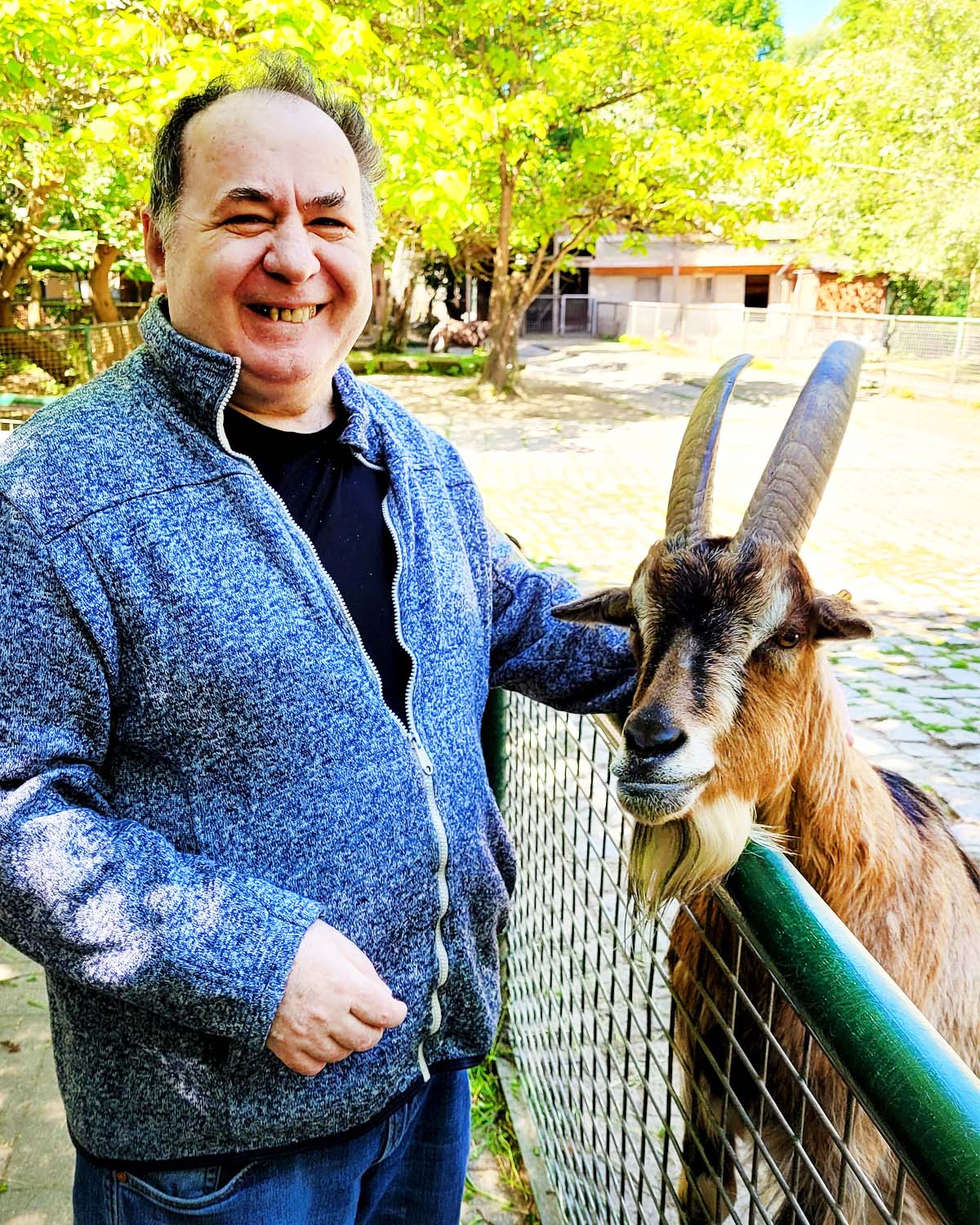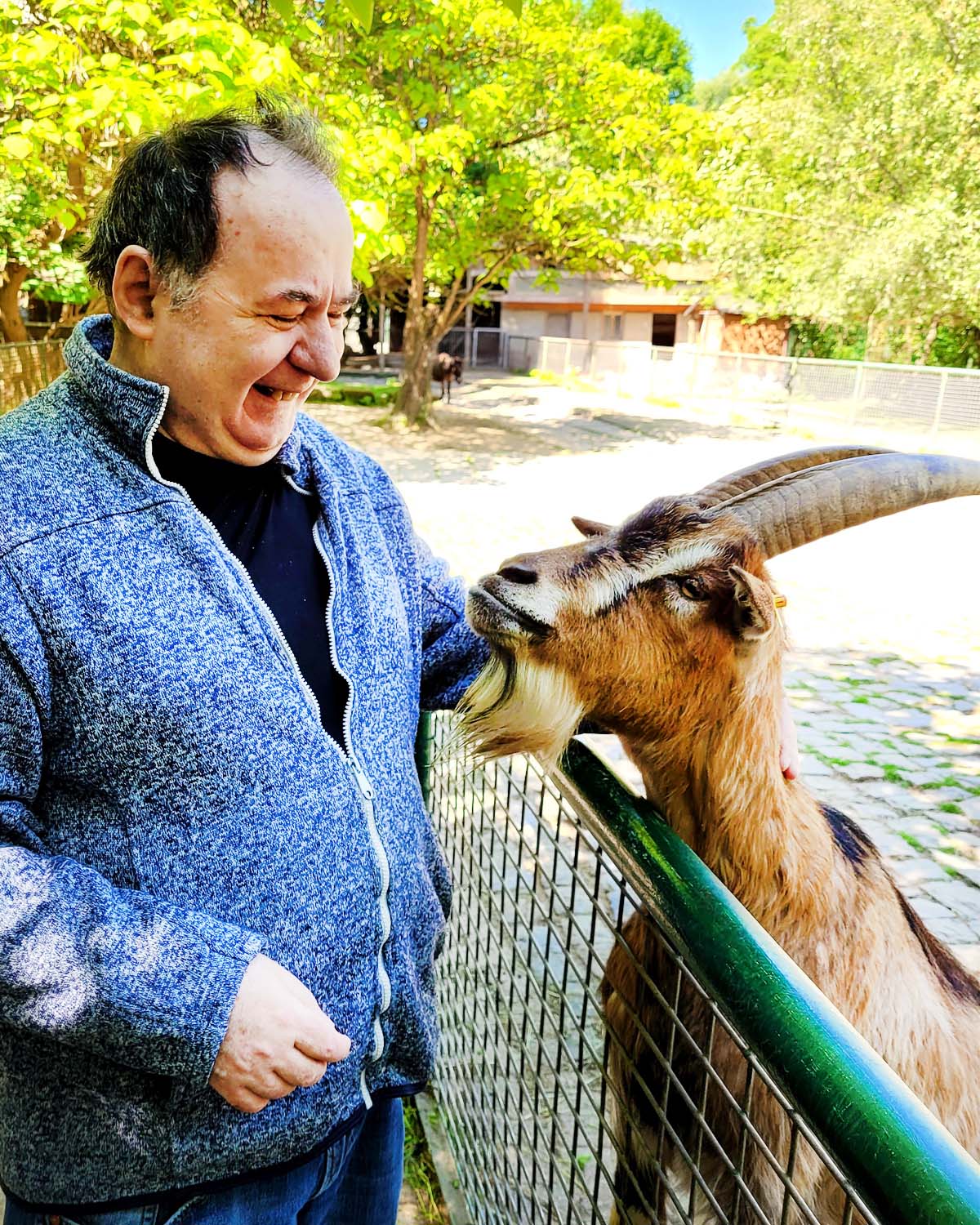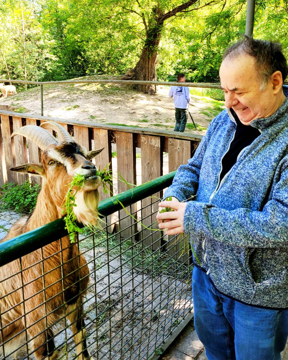 Am Streichelgehege angekommen wurden wir freundlich begrüßt – wer kann einem so tollen Lächeln schon widerstehen? Unser Bewohner M. jedenfalls nicht! Die beiden verstanden sich auf anhieb gut und der Bock konnte gar nicht genug von M. gestreichelt werden und kam immer wieder zu ihm.