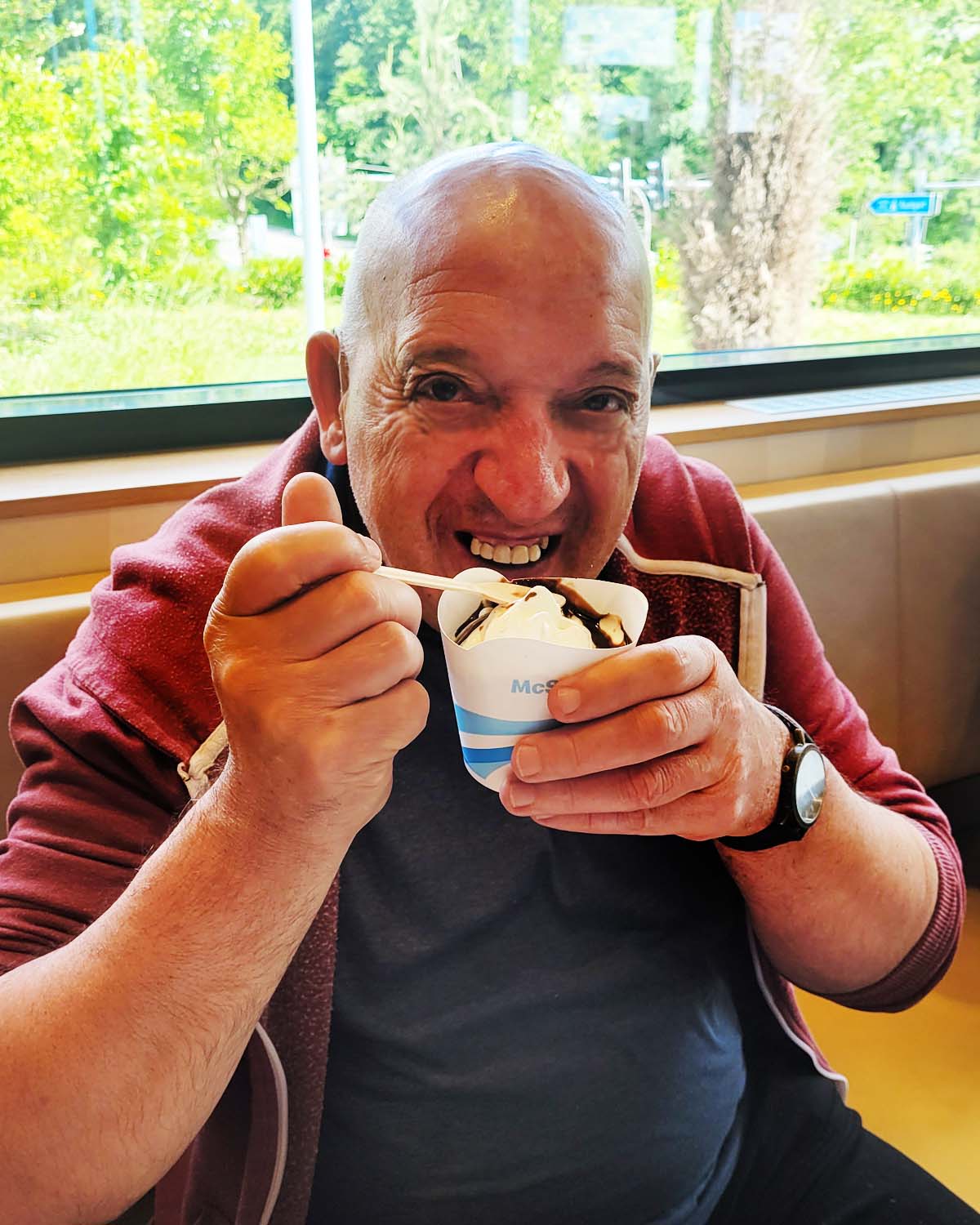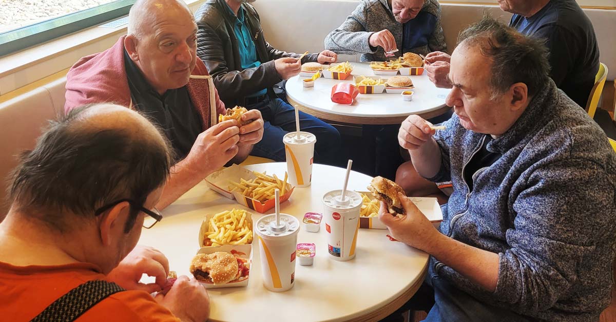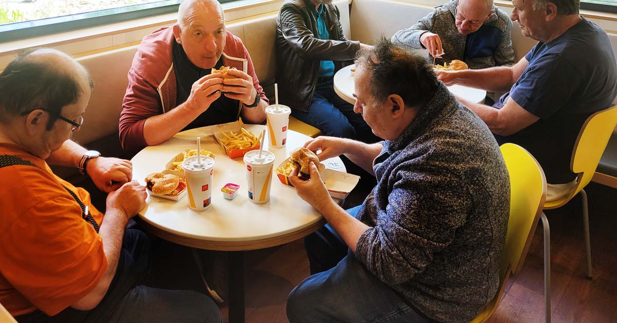 Nun galt es den tollen Tag noch zum Abschluss zu bringen und so gingen die gesamte Ausflugsgruppe zu Mc und ließen sich die bekannten Burger und Pommes schmecken. Zum Abschluss gab es auch noch eine Eis. Einige Bewohner wollten keines… als es aber dann da war, wollten sie doch eines und so ging unsere Kollegin leer aus, da sie ihr Eis doch glatt zur Verfügung stellt. Fazit: Es waren fast alle glücklich, bis auf die Kollegin, die bekam kein Eis ;-)